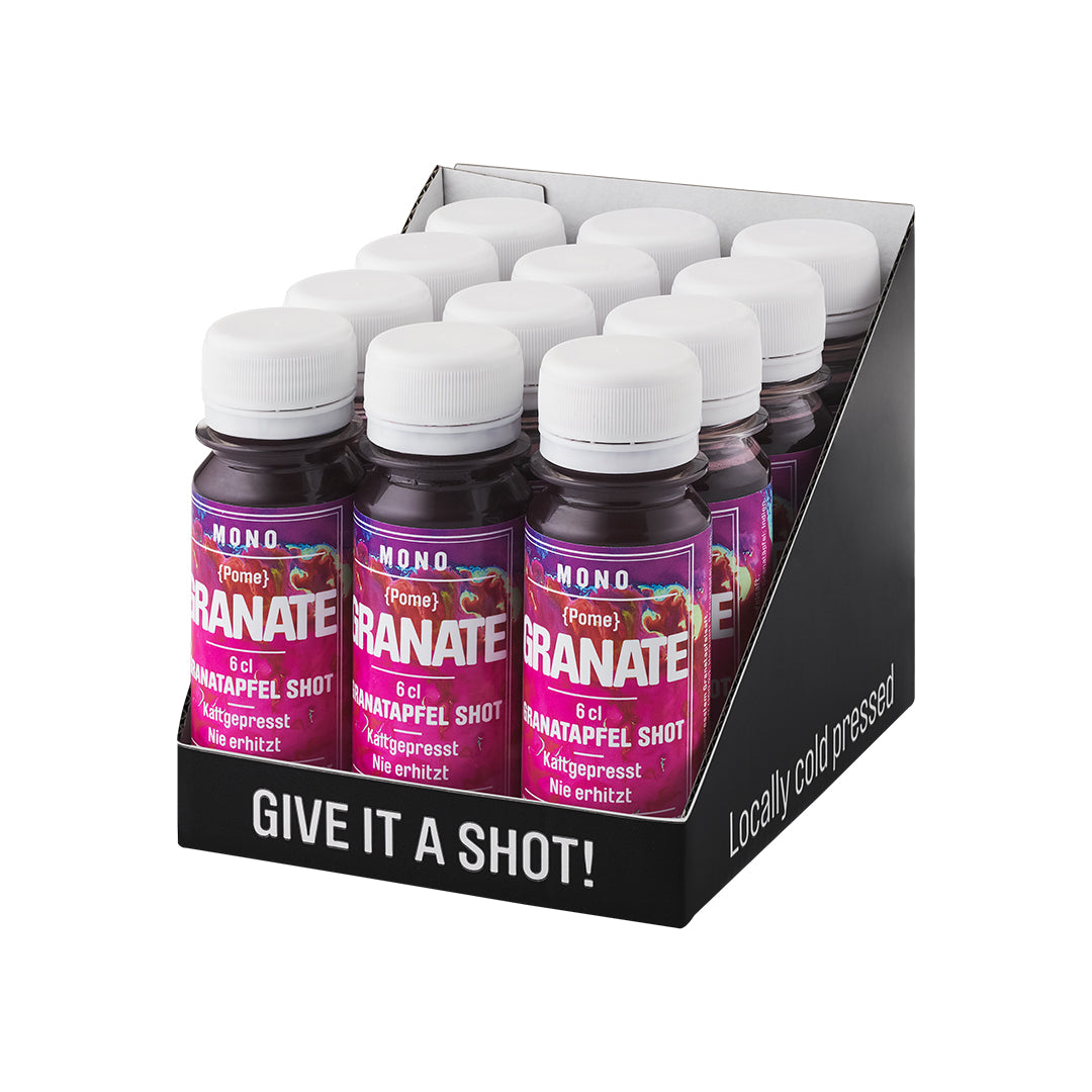 Damit die Qualität der GRANATE-Shots perfekt erhalten bleibt, bitte die Shots nach der Lieferung direkt im Kühlschrank lagern.