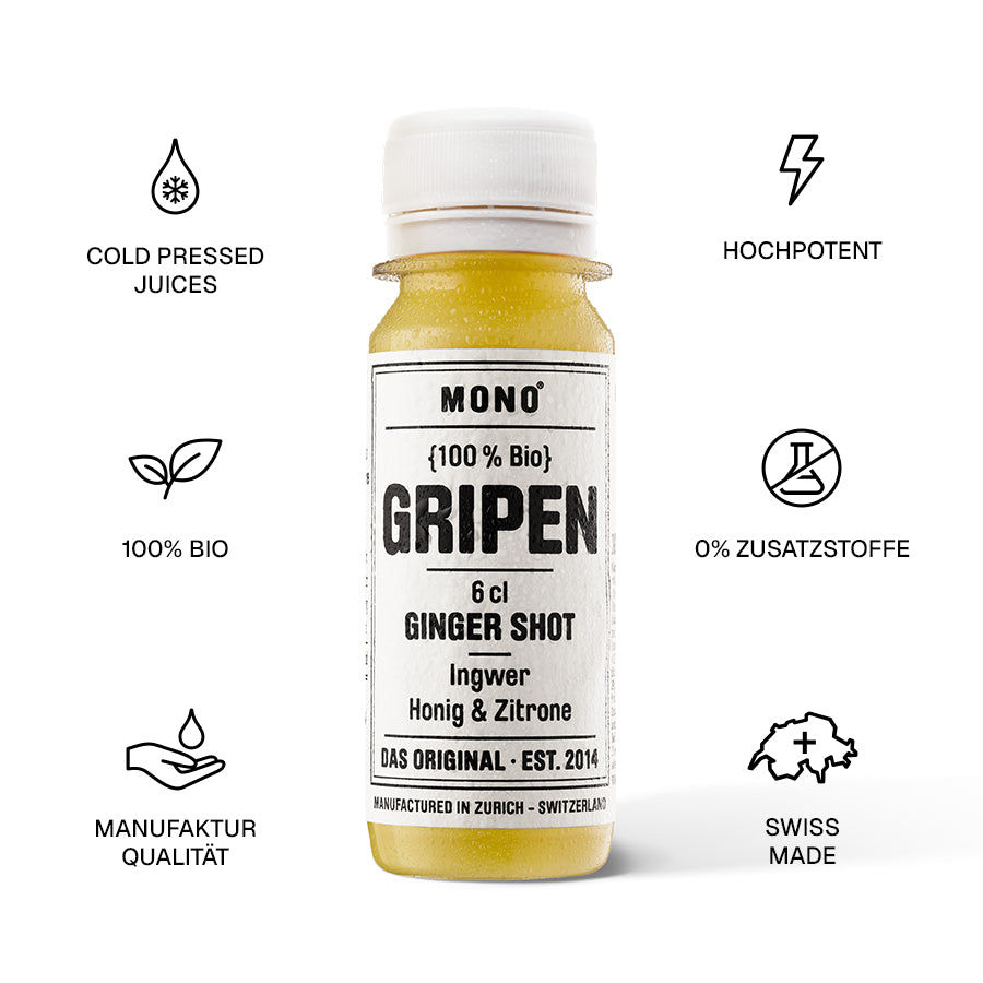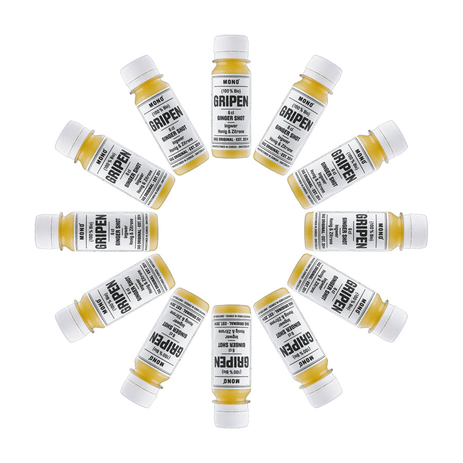 Qualité suisse rencontre tradition artisanale sans compromis. Chaque shot GRIPEN est pressé à froid et jamais chauffé. Intensité maximale, goût authentique de gingembre avec 100% ingrédients bio. Usage polyvalent: Pur comme energy shot, chaud comme thé au gingembre, froid comme boisson énergisante.